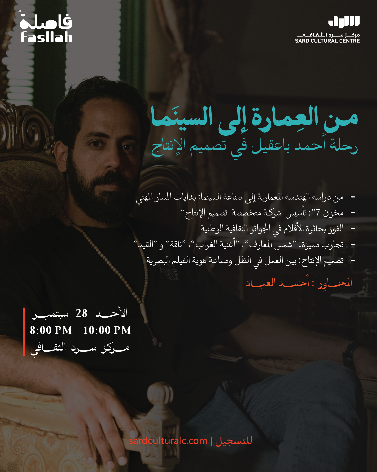 لقاء وحوار ملهم في مسرح مركز سرد الثقافي مع مصمم الإنتاج أحمد باعقيل، الفائز بجائزة الأفلام في الجوائز الثقافية الوطنية.