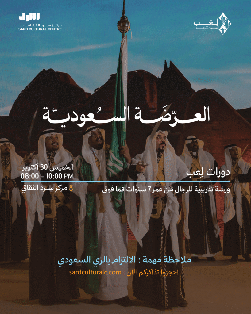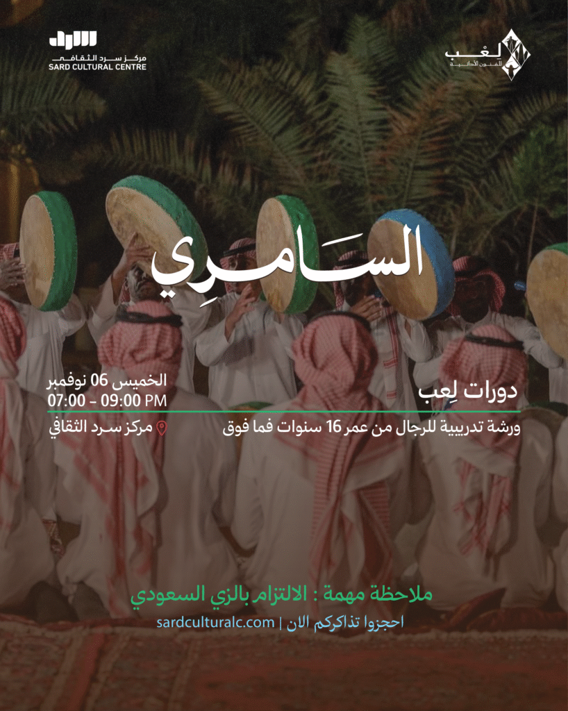 “من أعماق نجد، حيث تتردد أصداء الأهازيج على إيقاع الطبول، يأتي السامري ليحكي قصة فرح وأصالة. رقصة شعبية تجمع القلوب وتوحد الصفوف، وتنقل عبق الماضي إلى الحاضر. يقدم لكم معهد لعب في مركز سرد الثقافيورشة “السامري” – الفئة العمرية: من عمر 16 سنة فما فوق– ملاحظة مهمة: الالتزام بالزي السعودي