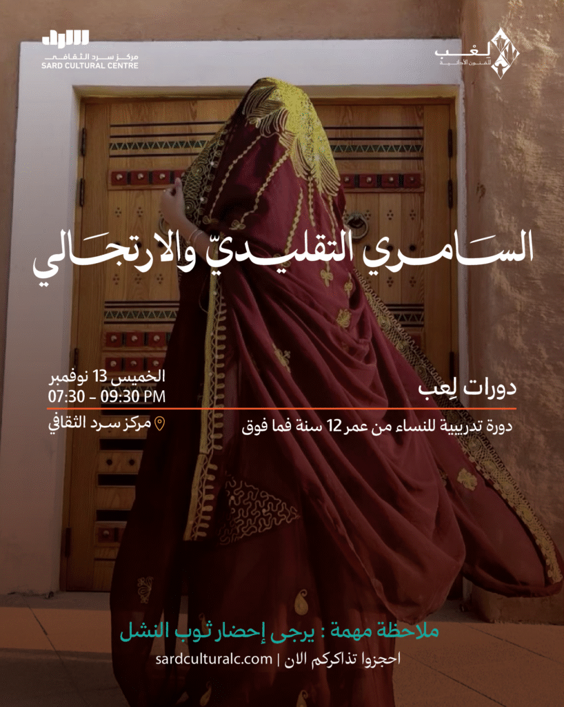 ( بناءً على رغبتكم اضفنا يوم جديد ) في “مركز سرد الثقافي”، ندعو بناتنا الشغوفات بالتراث للمشاركة في دورة “السامري التقليدي والارتجالي”. فرصة فريدة لتعلم أصول السامري النجدي، واستحضار روح الماضي بحركاته الأصيلة وإيقاعاته الخالدة. الفئة: للنساء من عمر 12 سنة فما فوق .ملاحظة هامة: يرجى إحضار ثوب النشل .