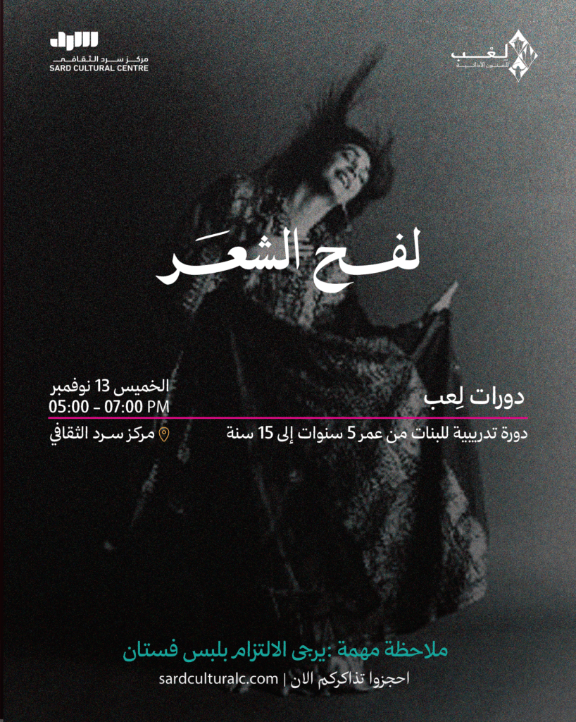 يا بنت ياللي .. شعرها يلفح القاع” “لفح الشعر” أكثر من مجرد حركة، هو تعبير عن الفخر والأنفة والجمال اللي ورثناه من جداتنا. في “مركز سرد الثقافي”، نفتح المجال لبناتنا الصغيرات ليعبرن عن فرحتهن وحيويتهن في دورة لعب مستلهمة من تراثنا الأصيل. الفئة: للبنات من عمر 5 إلى 15 سنة ملاحظة هامة: يرجى الالتزام بلبس الفستان، ليضفي جمالاً على حركتهن.